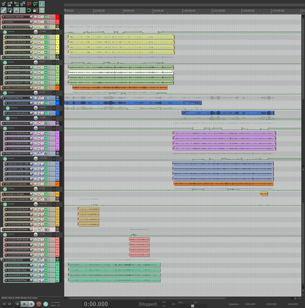 Track colour code: yellow downstream winter; pale green downstream spring; orange stream of consciousness upstream and downstream; dark blue hydrophone; mauve upstream winter; pale blue upstream spring. These files form the basis of the composition that was mixed down to a stereo format for the radio broadcast. Note the volume adjustment of tracks shown by the green lines with dots.