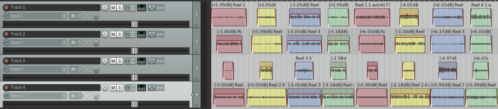 Reels 1 to 4 are coloured red, yellow, blue, green. The Reels from walk 1 are presented, then the Reels from walk 2. There is volume adjustment shown by the red lines.