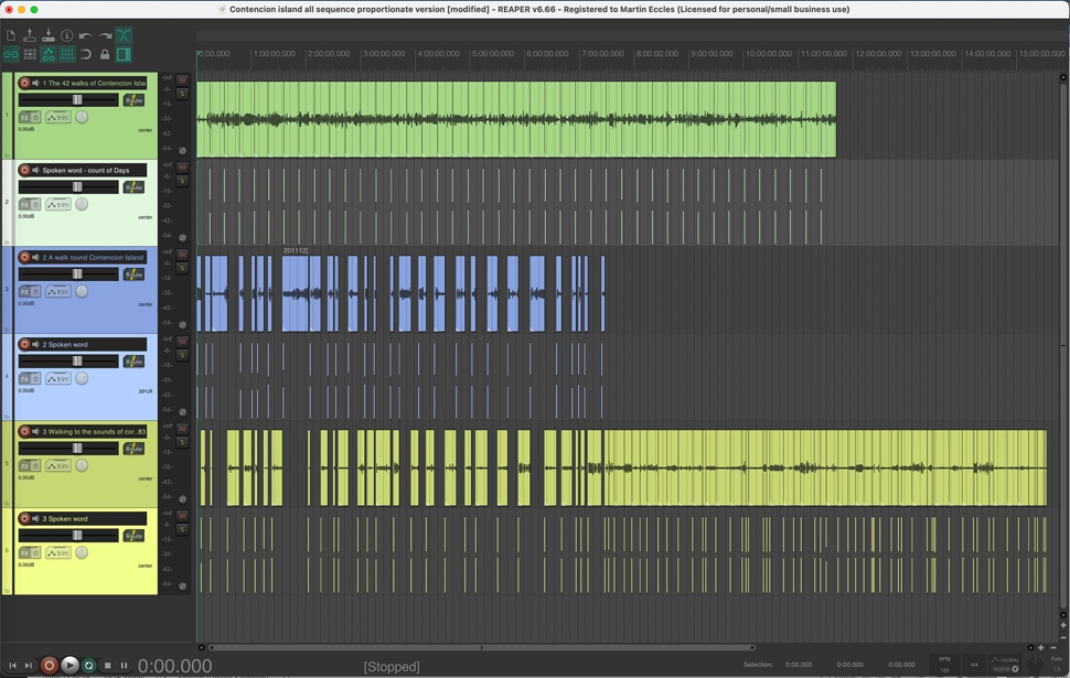 The left-hand side corresponds to 08:12:00 and all the tracks are then positioned at their time of recording relative to this. The seven blue tracks are the static recordings made in the outhouse, the two green tracks are the two island circumnavigations, and the red tracks are spoken word tracks. The short red 4th track is the spoken poetry; the three longer red tracks are the island names recorded with varying gaps between them. Shown here in their placeholder positions they were mixed into the performance at various and multiple points.