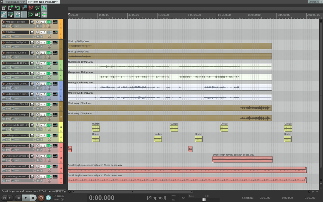 Track colour code: brown walk to and away from the mine entrance; pale green fell walk; pale blue mine walk; yellow rengas; pink mine names (used in performance). These files form the basis of the composition that was mixed down to a stereo format for the radio broadcast. The yellow rengas and pink mine names were used in several positions and combinations during performances.