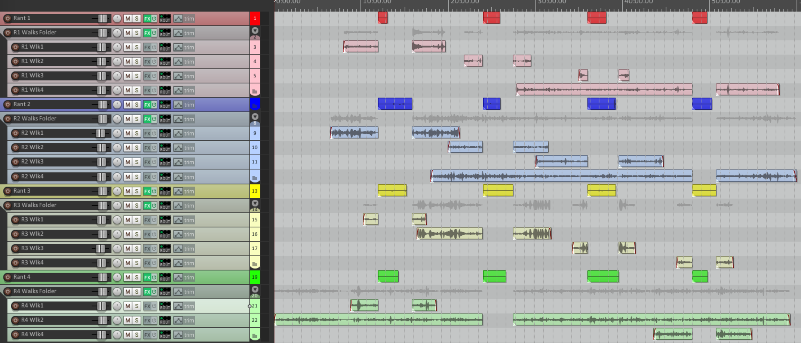 Rants are arranged vertically. Rant 1 is red, rant 2 orange and so on; each step has a walk recording and a subsequent shorter place recording in the track below it.