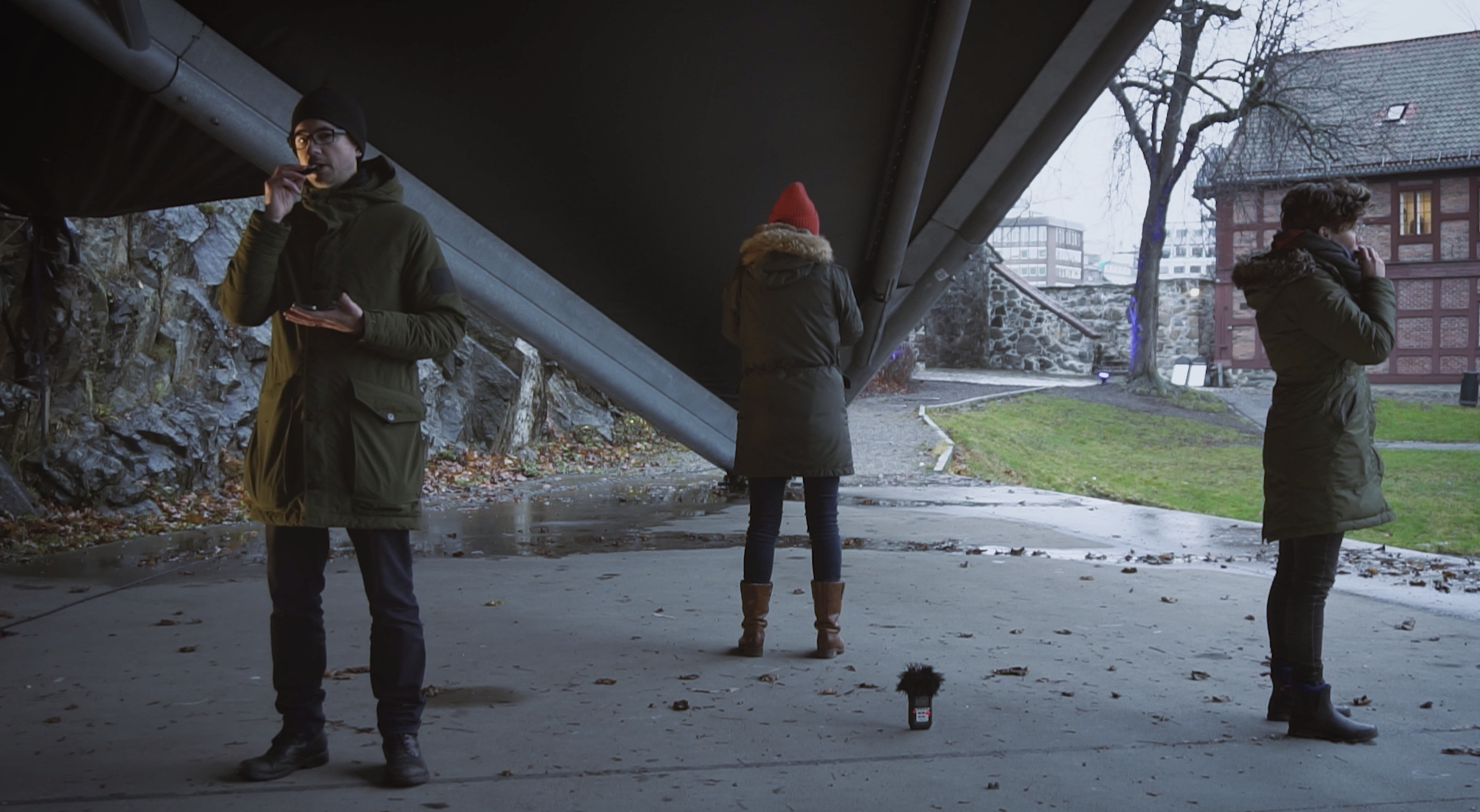 Anders, Jennifer and I are standing in a triangular formation, apart, with our backs to each other. We’re on an outdoor stage that’s been built for lively summer recitals at Karpedammen, at the Akershus Fortress in Oslo. Now it’s December, with dampness in the air and freezing rain. We’re going to play 2-Metre Harmony: Uncertain Chorales by Laurence Crane, for pitch-pipes, harmonicas and prerecorded sinetones (downloaded on our mobile phones played out through three small Bluetooth speakers placed on the ground). The pitch-pipes and harmonicas sound fragile, artificial and uneven as they rub up against the damp December air via our warm breath. Sometimes no sound comes out at all, just a hoarse rumbling. We’re playing for each other and the camera, there’s no audience here, large gatherings are illegal now.