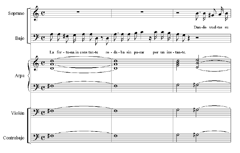 The tenor voice was used as a soloist in some villancicos, alternating with the soprano voice and it moved in a very broad register. In Jardinerito del Huerto Cerrado where the tenor sing jumps of 4th, 5th and 8th. Their relationship with the text is usually syllabic, except for solos where melismas may appear at the end of the sentence and coinciding with the accent of the word.