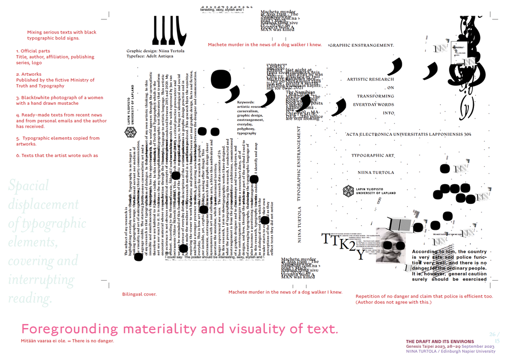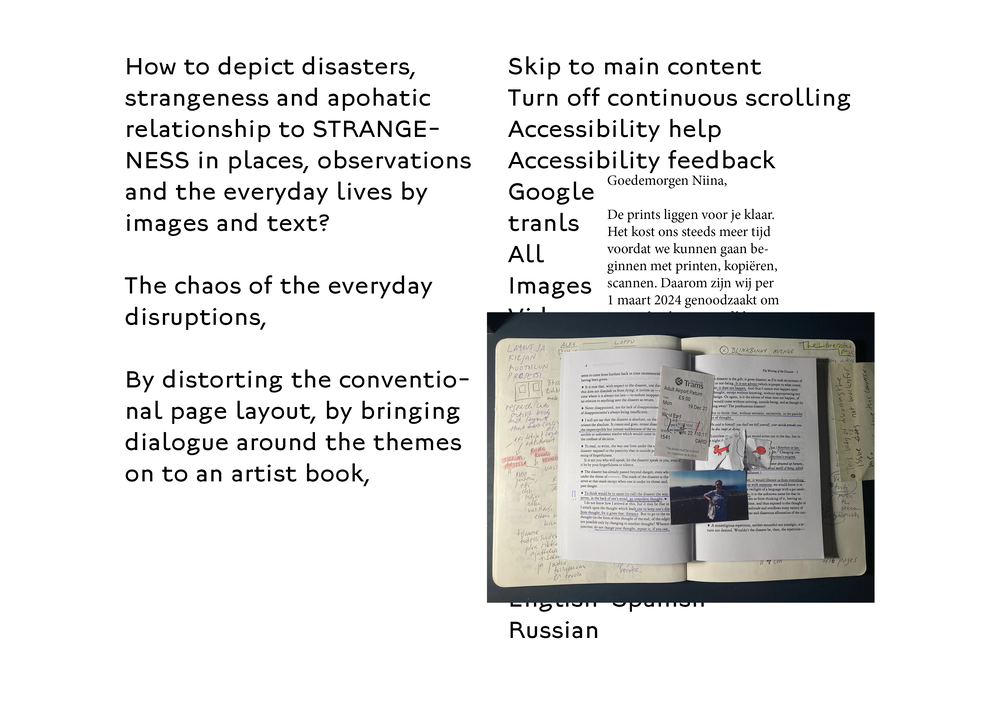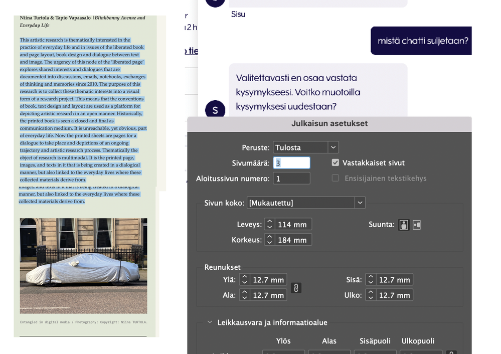This is a research project into building an artist book that uses typographic devices and page layout in construction a multilayered narrative. Everyday life and actual events are part of of the narrative backbone and this is mostly photographic material. Another layer consists on dialogues (verbal, email, etc) between 2015- and ongoing between the two researchers involved in the project. This is language-based written material. Third layer is the thematic context in building the actual book which happens in the academic presentations, performances and knowledge disseminations.