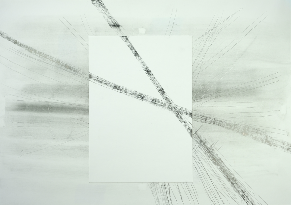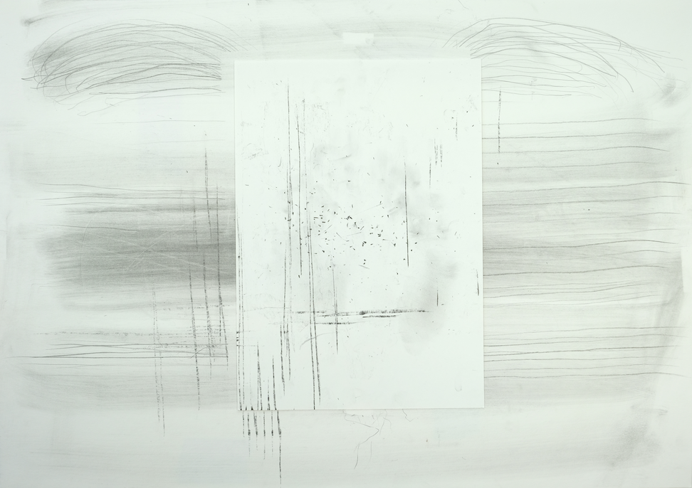 Sounding rather than touching. Letting a different kind of decision making enter this other time. Indentation. Register of contact. Of pressure, of force. Coming from beyond the frame, the frame remains. A line bends. This process makes evident the exclusivity of the frame, its agency of excluding as well as including. Trembling sense of force, of exertion. Releasing. Letting. Material exerts its own force. The paper too has bends and curvature, lines separating this from that, one part from another. Becoming horizon. Highlighting the corners, the space of shadow appearing. This blurring of the edge. Mirroring. Moving in relation. Delicate dance of connection. Both continuity and discontinuity between the frames. This parallelity of space, parallel spaces and parallel times. Cohabitation. Dissolving. Meeting. Breathing. Meeting. Continuity and discontinuity. Translation, meeting. Mirroring affect. Finding of a level, like water settling, oily. Surfaces settling, rising. Lightening.