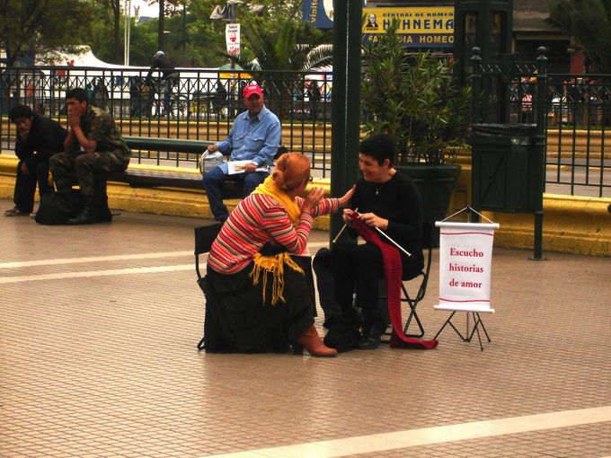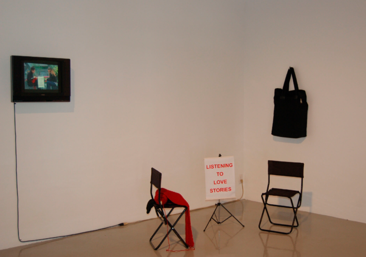 Listening to Love Stories (2005-2013), is an performance art piece, from Ana Teixeira (Caçapava, SP, 1957). The artist waits for an interlocutor to tell her some love story. While waiting, the artist weaves, and does not interrupt the process if someone arrives and sits down. Dividing attention between the interlocutor and the atention to the manual work, Ana acts as a listening person. The verb to listen, here, has a certain complexity, as it is close to actions that involve the other: telling, narrating and, mainly, “confessing”. Perhaps it would be interesting to investigate our past as confidant beings and, in this recovery, enhance the multiple readings of this action. (translation from the artist website)