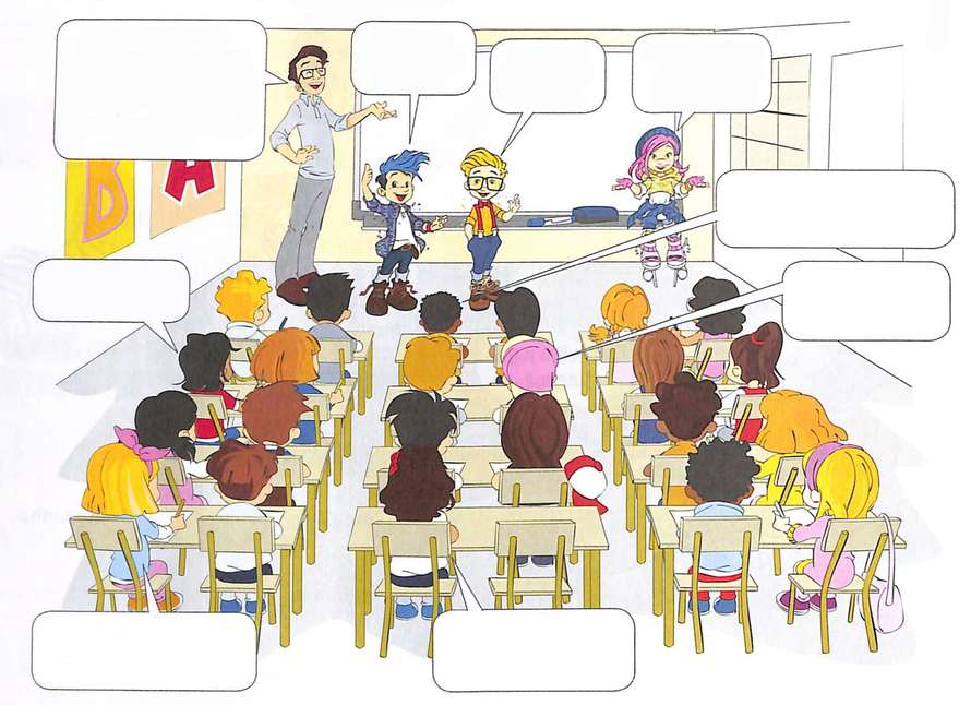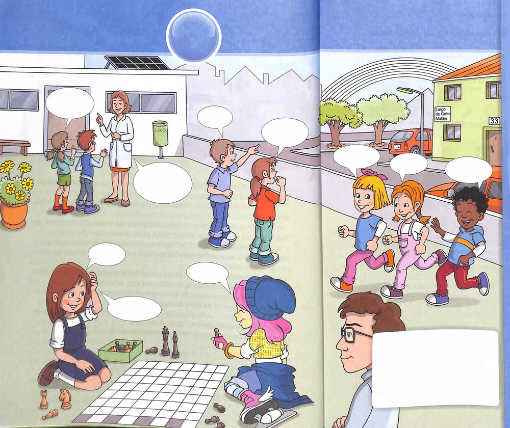 Voice 1: “First year, Porto Editora, 2022. We looked at this image, and the image on the following page. Both seem to have more or less clear contexts, but some of the interesting aspects were (one is a more or less school setting, at least in the second image) the absence of older people. Also absent are people showing any disabilities, except for the issue of glasses... However, when we see that, in the other image, which is more (and the children are all facing away)... but here we get the sense of a population representing a more or less middle class. There's an interesting aspect of having a girl with a more alternative appearance playing with a girl who seems to be wearing a uniform or more formal school attire. And then, it seemed to us that in both images, there was some effort to break stereotypes. Here, in the same book, there's a rainbow that isn't coloured in. And then, according to the instructions, the student is to colour the rainbow correctly. But we can also say that the uncoloured rainbow might convey another message, right? [...] Here, there seems to be some effort to break certain stereotypes. For example: showing a male primary school teacher when primary school teachers are still predominantly female; showing a boy with glasses saying that he likes to play the drums, and a boy with a more alternative look and blue hair saying that he likes to read; there also seems to be an attempt to diversify... to diversify skin colour, although it still mainly shows boys; in another image, girls are shown playing football; almost always pairing a boy with a girl.”