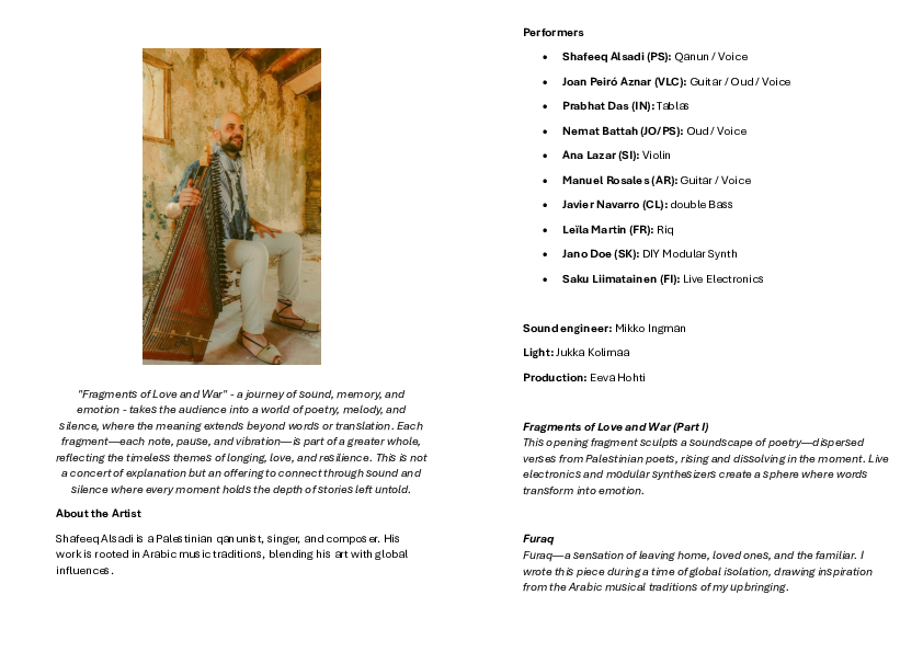 The final concert of my Master’s studies in Global Music at Sibelius Academy, “Fragments of Love and War”, brings together diverse voices, traditions, and artistic expressions. Rooted in the spirit of intercultural dialogue. The collaboration with musicians, poets, and improvisers from various backgrounds infuses the performance with a rich, multidimensional texture, blending the personal and collective experiences of love, loss, and resilience. This shared creative process amplifies the narrative of Palestinian identity and the universal power of art to bridge cultural divides, inspire empathy, and celebrate the beauty of human connection amidst adversity.