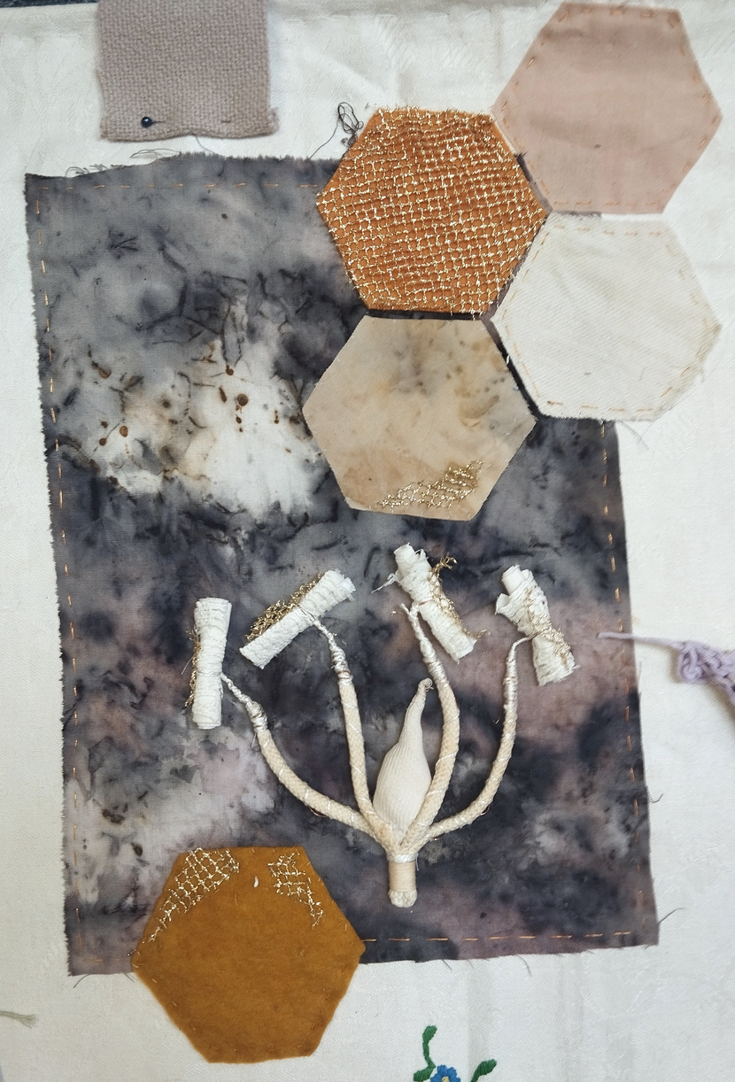 I prepared the background specifically for the quilt earlier this summer. It is dyed with plant material from the house, garden and nearby forest of the house that was my family's base since I was two years old. The dark greys are from rusty florist's chicken wire I found when sorting through boxes and boxes of accumulated memories in preparation for my Mother selling the house. Bringing the personal and the textile (a hobby?) into the academic context of environmental history is essential, I think, but not straightforward. I made a textile cover for my doctoral thesis, and have since continued to play with the idea at the edges of my research.
