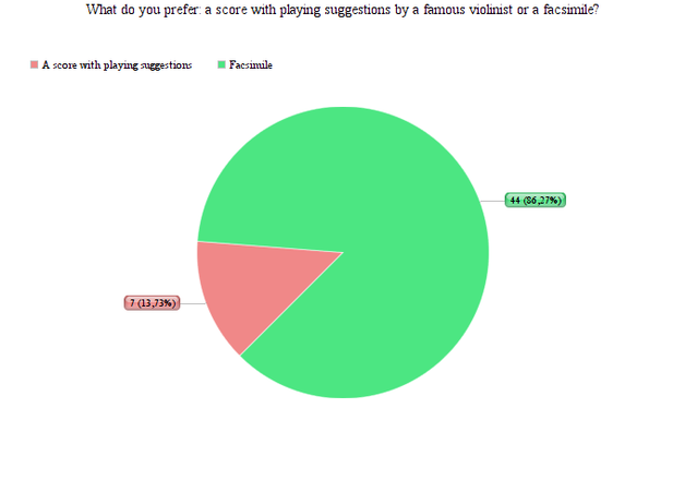 From the previous answers to the following question it shows that the historical correctness is regarded as very important: “What do you prefer: a score with playing suggestions by a famous violinist or a facsimile?” A remarkable 86 % chose the facsimile.
