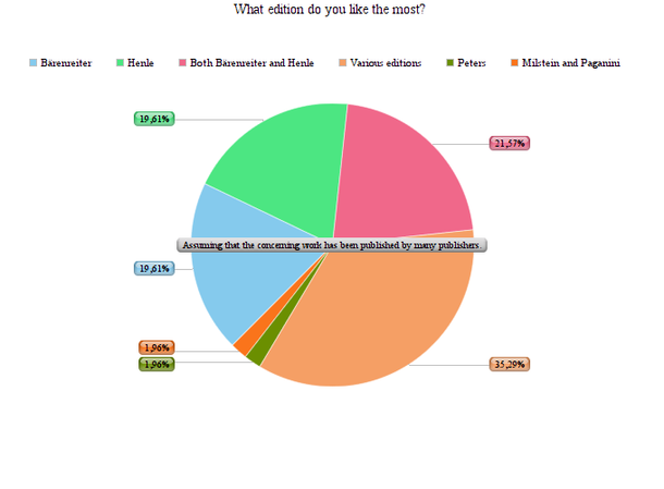 The answers show that both Bärenreiter and Henle are the most popular editions. Separate from each other these two publishers are named 19,61 %. 21,57 % named both bärenreiter and Henle. Adding up these numbers, it means that in total 61 % would like to have an Urtext edition by Bärenreiter or Henle. The piece ‘various editions’ means that the violinists did not mention a specific publisher and that they depend their decisions on various factors.
