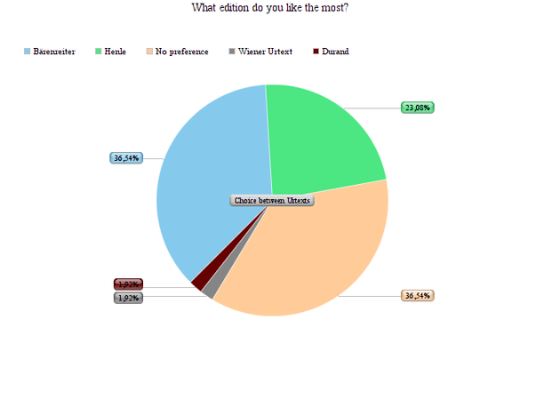 The last question is a continuation of the previous question. The previous question was about naming publishers you know by heart. This question is again “What edition do you like the most?” as was the first question but now referring to the named Urtexts. So this last question concerns only Urtexts where the first question concerned all editions. Notable is that the balance between Bärenreiter and Henle is not completely equal anymore. This question shows that more people have the tendency to prefer a Bärenreiter. Bärenreiter and ‘no preference’ are both chosen 37 % where Henle was chosen only 23 %. Durand and Wiener Urtext were chosen just once and Peters and Breitkopf did not appear in the preference at all.