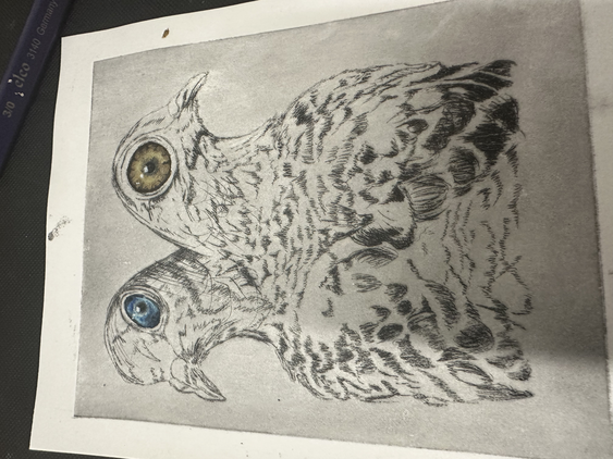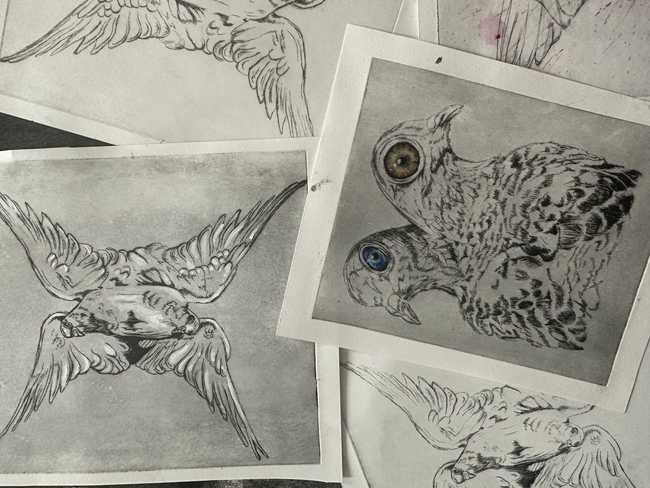 Using drypoint graphic techniques and mixed media, the work captures various stages of mutation, blending pigeons with grotesque and absurd forms.