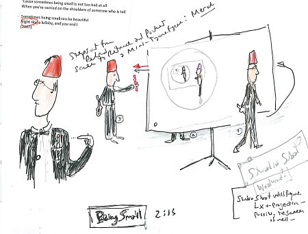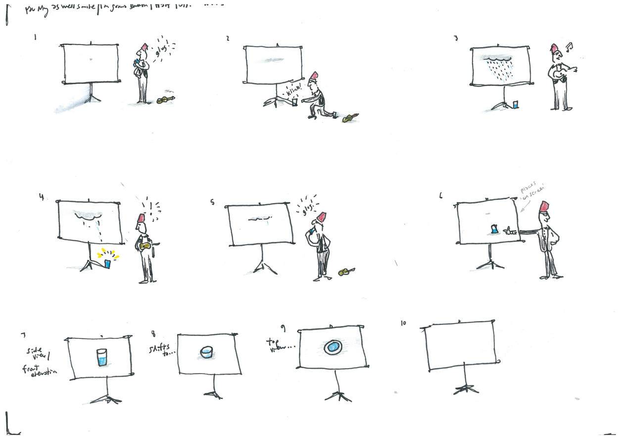 Sometimes the writing involved drawing. It can be better draw a series of stage images than write them, especially once those images become recursive. In this project for example, the images of screen on screen involved in the mise en abyme sequence were more easily drawn than described.