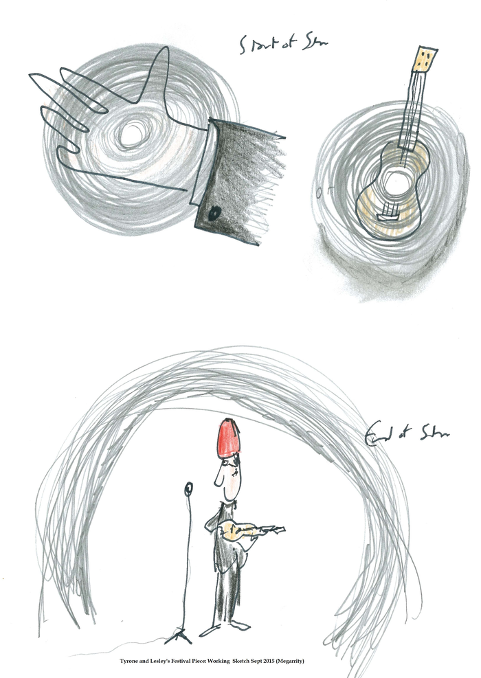 Tyrone (David Megarrity) & images from notebook illustrating initial ideas and images sourced from original song lyrics