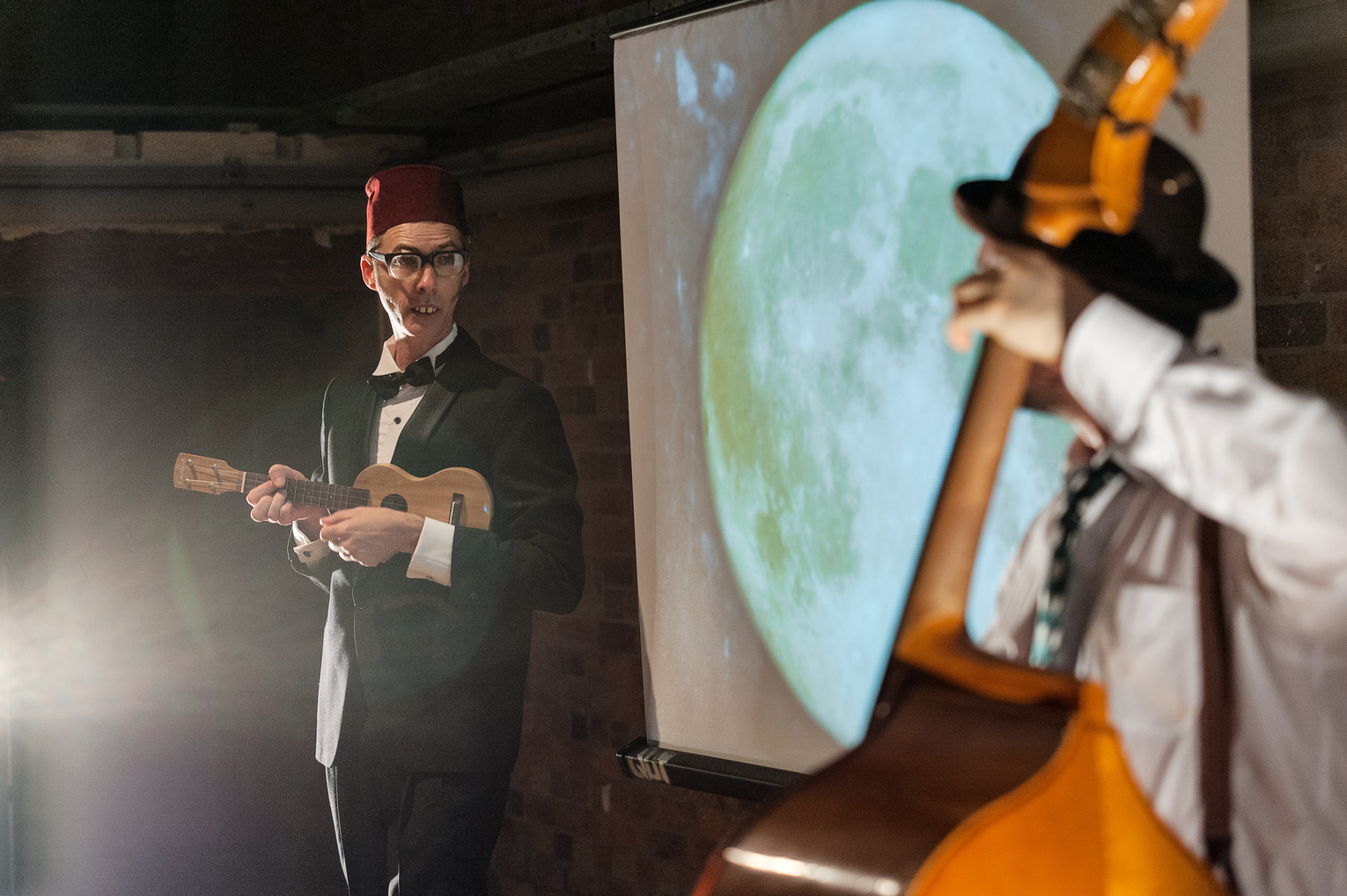 In plain language, what seems like a very simple musical presentation, accompanied by some visual elements, eventually reveals a much more complex intermedial performance, without pointing to, or advertising that complexity. In the show, Tyrone and Lesley play original songs on ukulele and double bass, alongside projected images. At a glance it might look like Post-Vaudeville. There is little backstory or exposition. The performers are clearly aware that they are employing these apparently lame production elements to enhance the quality of their regular presentation.