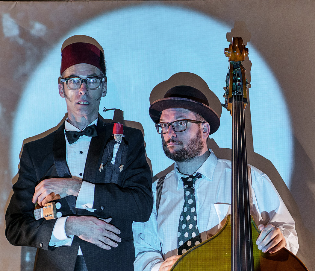The show was led by music, namely a repertoire of original compositions created for ukulele, double bass, lead and backing vocals. Unclassifiable as a single genre, they traversed jazz, Tin Pan Alley style ballads, torch songs, comedy songs, absurd musical jokes, instrumentals, and experiments with found text. Almost all had been recorded on four independently released albums over the preceding five years. Many had been road-tested with audiences on stages designated for both theatre and music while some were new, unrecorded compositions. While they contained lyrics, we treated them ‘as music’. Wolf observes that a song ‘...is a rare example where overt and covert music-literary intermediality coincide’ (1999: 187). Suzanne Langer tells us that: