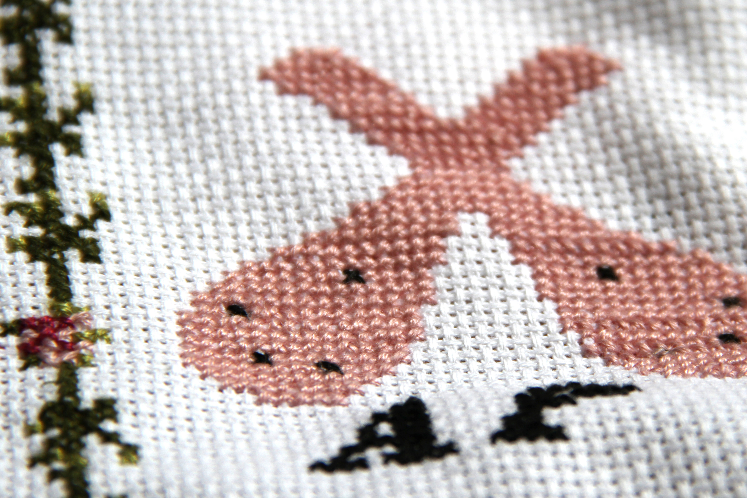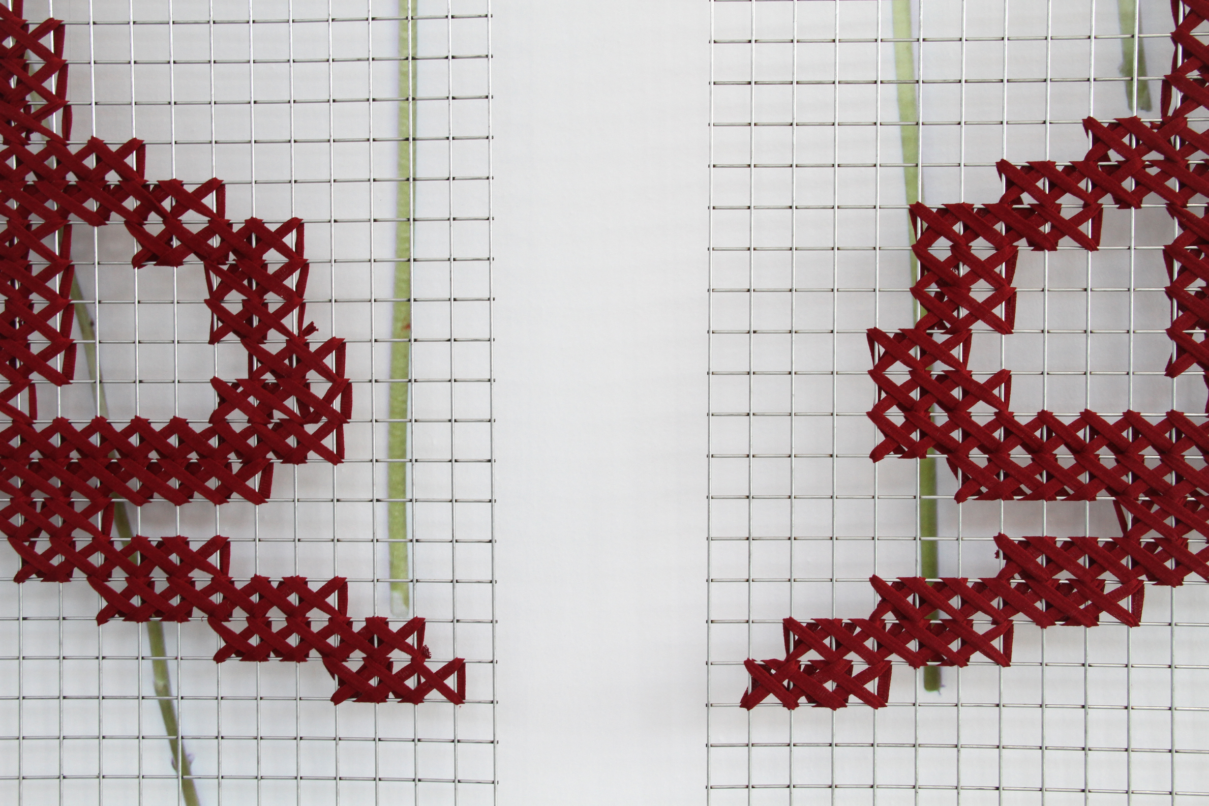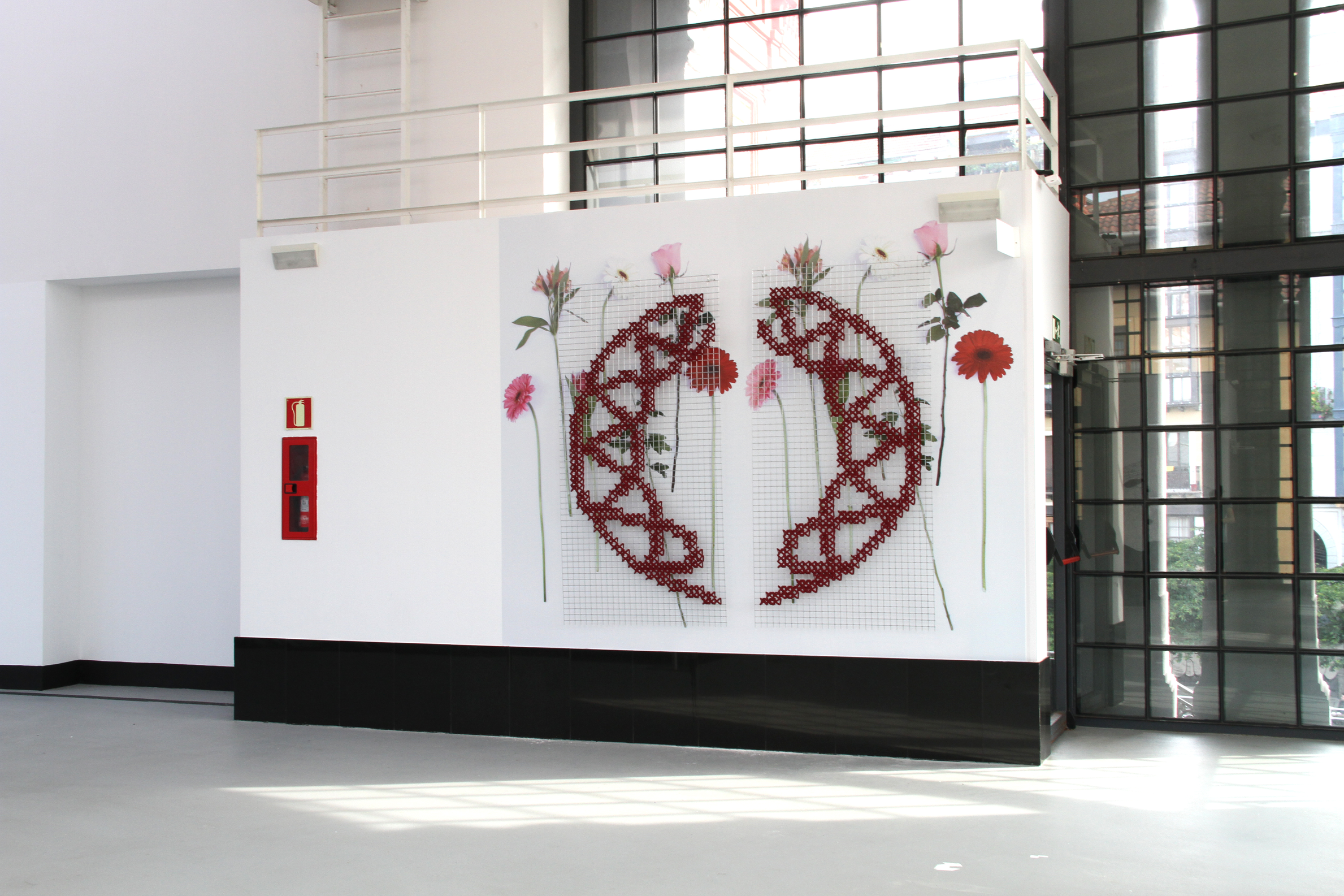 The following materials are used for this: a piece of vinyl with images of flowers which belonged to a branch stuck to the wall, and cross-stitch embroidery in wool on a wire mesh background.