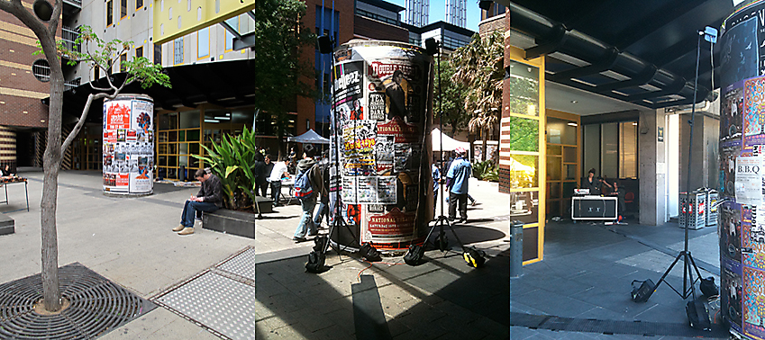 The site was selected for intervention due to the noise source’s seemingly incongruent relationship with the communicational needs of people who use the space.As a primary entry point to popular RMIT amenities – including the library, cafeteria, and thoroughfare to the university’s main entrance – this space is a node for meeting and transition. Many students and staff stop at the site to talk, relax, and eat lunch. There are also weekly markets and events held in the space. Students were asked to consider the interrelationships between the two intertwining spatial dimensions – acoustic and social. To encourage this thinking, students were introduced to philosopher Henri Lefebvre, who indicates that the social dimension of space is, at least partly, shaped by the presence and action of people. Lefebvre states that an “approach is called for today which would analyze not things in space but space itself, with a view to uncovering the social relationships embedded in it” (Lefebvre 1991: 89). Accordingly, considering those relationships that were perceived to exist between the noise source and human behavior were made integral to the design process. As discussed below, the design process revealed a power complex underlying the formations of social relationships with which the soundscape designer, as activist, must contend.