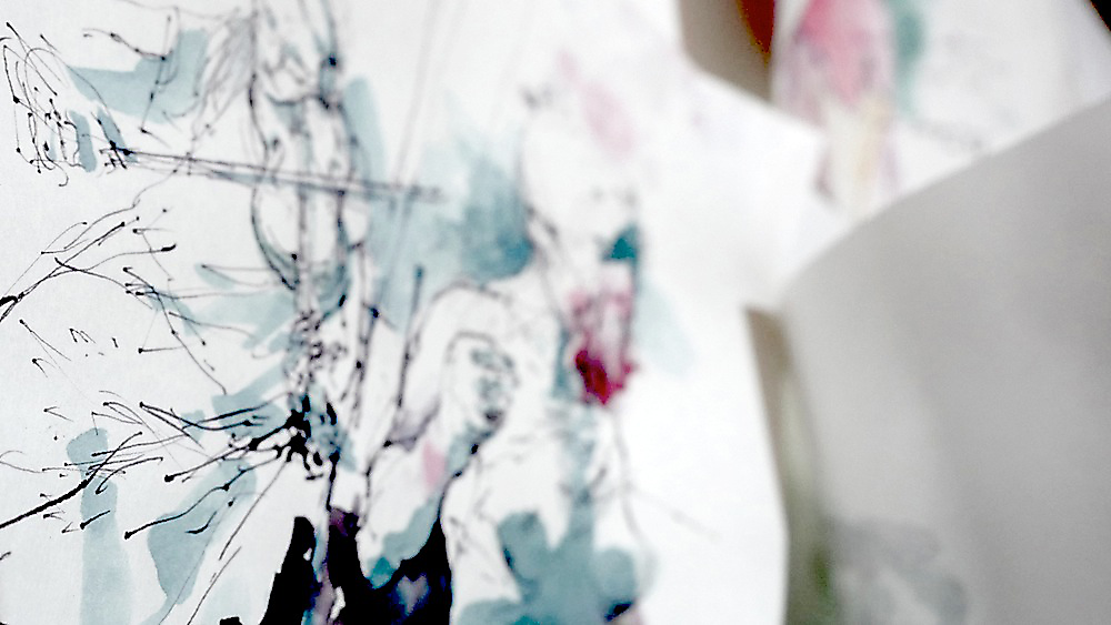 Tullah and Tom: rehearsal video of drawing process — ink on rice paper, 2.5m x 1.5m.