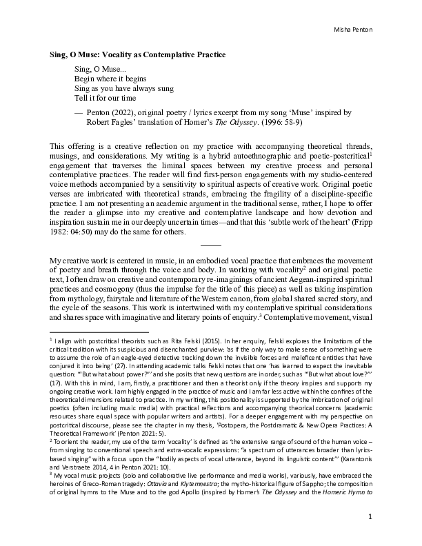 My practice as a singer-composer explores the sonorous expressivity of poetic language in a relational multi-layered meaning-making process. Drawing on a studio-centered contemplative approach, I focus on the intertwined and liminal spaces between my creative process and personal contemplative practices. My writing is a hybrid autoethnographic and poetic-postcritical engagement within a theoretical frame centered on the work of Robert Fripp and Maurice Merleau-Ponty. I re-envision and re-imagine artistic discipleship, that is, the artist as disciple of the Muse—defining the Muse, in part, as the energy signature of a creative discipline. This energetic presence evolves and morphs as an inspired, externally perceived sacred source and as an internal guide inherent to the human psyche and to the artist’s creative process.
