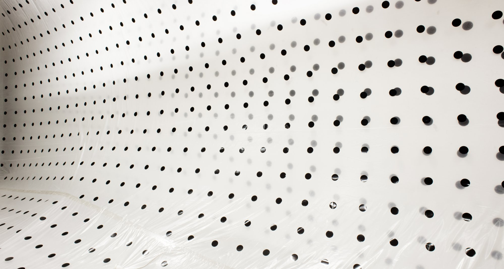Crucially, the grid of black dots was replicated at the same size and scale as the surrounding environment, and the reorientation and doubling of spaces created an optical effect of vortex-like spirals in the misalignment of patternings where the rigid language of the building came into dialogue with the soft inflatable skin – a sort of talking over the top of each other. AJ8 took the language of the Design Hub and ‘rephrased’ it, disrupting its more regular rhythms. In doing so, the project emerged as something that is almost of the same architecture, but with a strangeness or excessiveness that distinguishes it from, and points back to, the quirks of the surrounding environment.