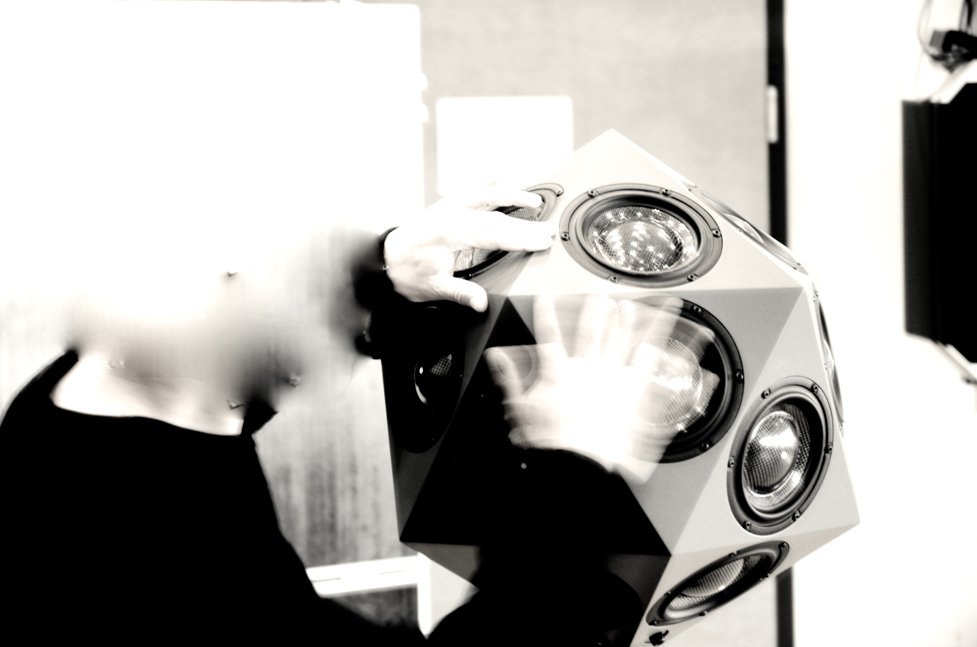 In electroacoustic music, the notion of adjustable-directivity loudspeakers was introduced in Paris in the late 1980s by researchers at IRCAM. For the renowned concept study “la timée” [WDC97], a cube housing six separately controlled loudspeakers was built to achieve freely controllable directivity. Despite the ingenious idea and theory, loudness and focusing strength weren’t convincing enough to be employed in concerts. In 2006, researchers at IEM (University of Music and Performing Arts Graz) reconsidered theory aiming at an acoustically correct and powerful reproduction of musical instruments in their lower registers, including the entire 3D directivity pattern. The resulting icosahedral loudspeaker (IKO) is more powerful, of larger size, and larger number of loudspeakers. Moreover, a success in quality was achieved by reconsidering algorithms and acoustic calibration to control sound beams [Zot09] that are three times narrower than beams of earlier systems.