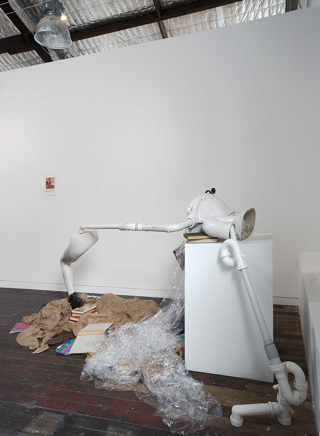 As part of her exit in both works, Baroness Elsa is literally stomping on the authoritative books of the art establishment that are being further damaged from the water or urine that gushes down from her work Fountain. Fountain sits on an institutional plinth to symbolise its new status as an art object, replacing its former use as a pet drinking bowl, which Baroness Elsa had kept in her flat with a range of other plumbing objects. A pipe sits atop of Fountain, which I, along with others, believe represents one owned by Marcel Duchamp ‘so that the image becomes emblematic of their spoiled relationship’.[x]