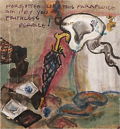 In 1923 or 1924, Baroness Elsa painted Forgotten Like This Parapluie Am I By You – Faithless Bernice! that has been described as ‘mournful’ and from a period where she felt ‘abandoned by her friends’, as indicated by one of them ‘leaving’ the painting’s frame.