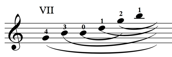 Another common device for arpeggiation on baroque guitar as well as theorbo is to pull backwards the index finger through multiple strings. Combined with the effect of imitating a reentrant tuning, the same arpeggio of the above sound example is as follows: