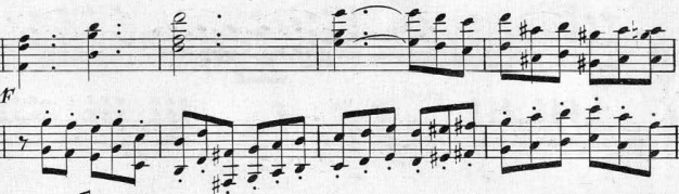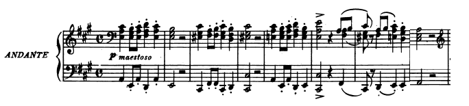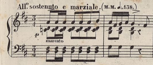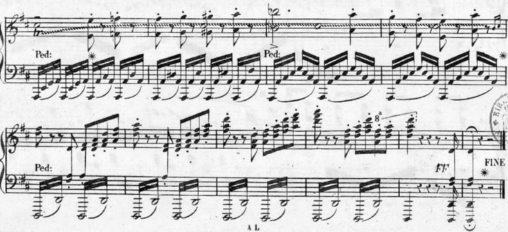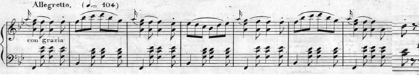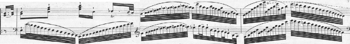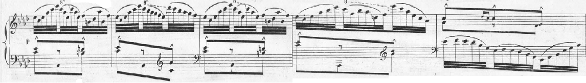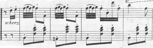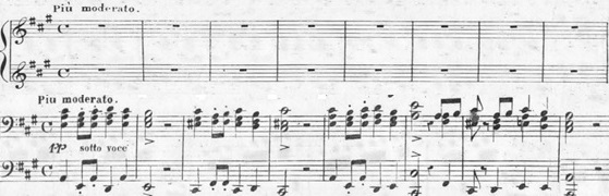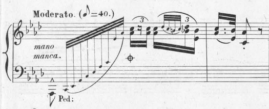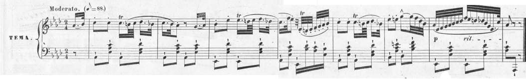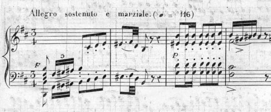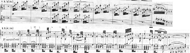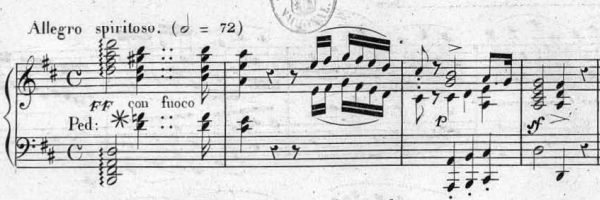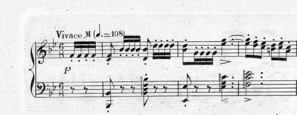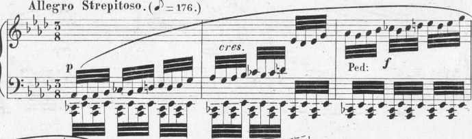 The Allegro strepitoso bursts with brilliant writing of scales (Right hand) and tremolos (Left hand) that goes from piano to forte over an unexpected A- flat minor harmony that dilutes in the dominant in pianissimo to prepare the moderato.