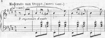 After this exhibition of mechanism that seems presented as a coda of the first theme, a new thematic material appears under the indication of motivo vasco (Basque motif) that gives the name to the piece. Everything seems to suggest that the motive has its origin in the popular dance and singing: tempo Moderato non troppo, espressivo il canto, 3/8, very rhythmical accompaniment, the type of ornamentation we find in the melody and even the structure of it -8 bar phrases and ABA form. The new material brings with it a new key, E-major, and the new bar, a new metric sensation: