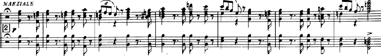 Solving the tension of the dominant seventh chord from the last measure of the previous section enters this Allegro sostenuto e marziale in B minor that works as finale and coda of the piece. There are four pages, again, of varied virtuosity, which include several of the most demanding designs: repeated double notes and chords, octaves and scales in staccato and broken octaves. In addition, some of the material used by Albéniz has a clear connection with the Allegro sostenuto and marziale from the beginning of the opera.