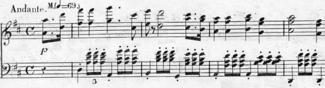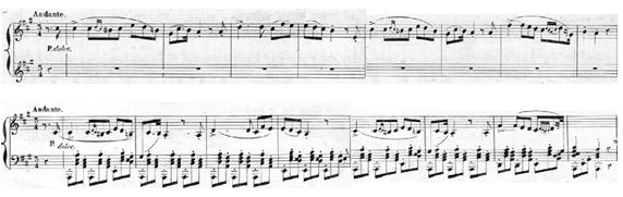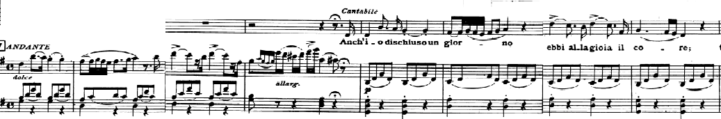 The following Andante is one of the main parts of the piece and belongs to the Scena Ultima of the Opera by Donizetti. Written in the bright key of D major, it looks like a large finale written in ABAB form. The first part is the main theme of the section, where the melody sings in octaves over an accompaniment of repeated chords (the first time) and wide arpeggios of thirty-second notes (the second time). The second part carries out a contrast again. A contrast in tempo, writing and above all, character. Starting from the lightness, the sweetness and the agility of the right hand we reach an energetic and pathetic end that culminates, in the first case in an Adagio that leads us again to the first part and, in the second one, in an extremely demanding and apotheosis end.