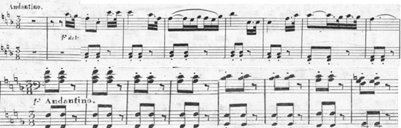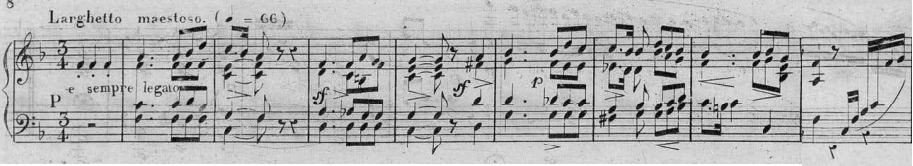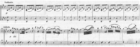 The Larguetto maestoso in F major is a clear transcription of the orchestral tutti that accompanies this quartet in the Opera. Very few variations are done and all of them within the corresponding harmony (e. i. b. 101-108 and b. 118-124). The section can be divided into two thematic materials which are repeated, as always, through the variation. The sixteen notes triplets lead us to a four-bar codetta of the section.