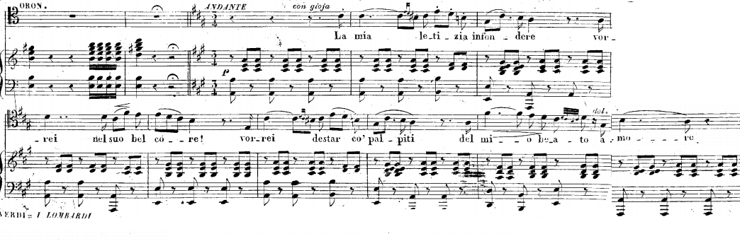 The Fantasía para piano a cuatro manos sobre motivos de la ópera I Lombardi de Verdi is the shortest one - contains only one fragment from the opera- which proceeds from the Andante of the scene number two of the second Act. The fragment fits perfectly as the B part of a three-part fantasy and as a perfect contrast between two fast movements: