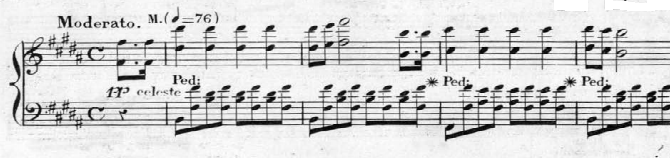The moderato, already in major mode, opens with the specification of playing the bass with the left hand (mano manca). It is built with a two-bar motif that brings together the arpeggio of the corresponding harmony with a melodic motif that also combines triplets and dotted rhythm in the corresponding harmony.