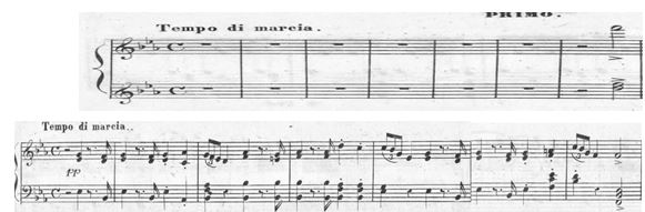 Finally, in the Fantasía para piano a cuatro manos sobre motivos de la ópera Attila by Verdi, which is structured also in four parts like Ernani´s, is again the slowest fragment the one that comes from the opera and again from an introductory part. In this case, it comes from the “scena and cavatina” from the prologue entitled “Allor che I forti corrono”.