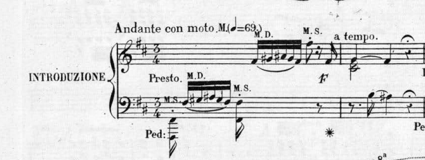The introduction starts with a surprising tempo indication that shows a contrast between the first two musical ideas of the piece. Despite suggesting “Andante con moto” as the general tempo, Albéniz writes “Presto” on the first motif of sixteen notes and, one bar later, “A tempo”. After those first five bars, it starts the real introduction: tremolos in the left hand and octaves over it shaped in a very long line that finishes, of course, in a small cadenza typical of his leggiero style. A new motif built with triplets of sixteen notes (as drumrolls) warns us that something macabre is about to come.