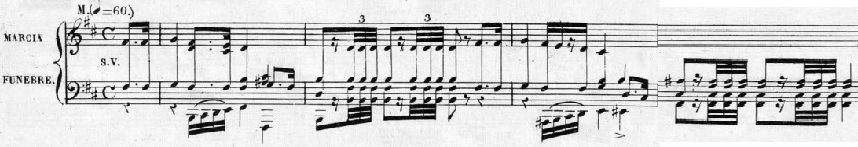 The funeral march enters without hesitation (attaca) and under the indication of sotto voce. The fragment is a dialogue between a quartet and the unappealable answer of the death. Built with the same melodic and harmonic material, it can be divided into two parts according to the register employed: the first eight bars, sotto voce, belong to the darker environment and the next twelve, move to the middle register of the piano towards an espressivo feeling. Furthermore, the passage is a literal quote from the Opera (Scene VI, Maestoso) where Lucia collapses and it is not clear if she will live or die.