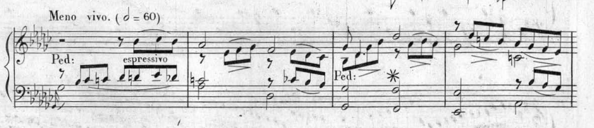 The meno vivo presents a considerable contrast with the previous one. Change of tonality, now the light comes in with G-flat major, texture, and ambiance. Written as a string quartet, has a more polifonic content that will evaporate through a diminuendo, a ritardando and towards the new change of tonality, F major and the first fragment taken from the Opera by Bellini.