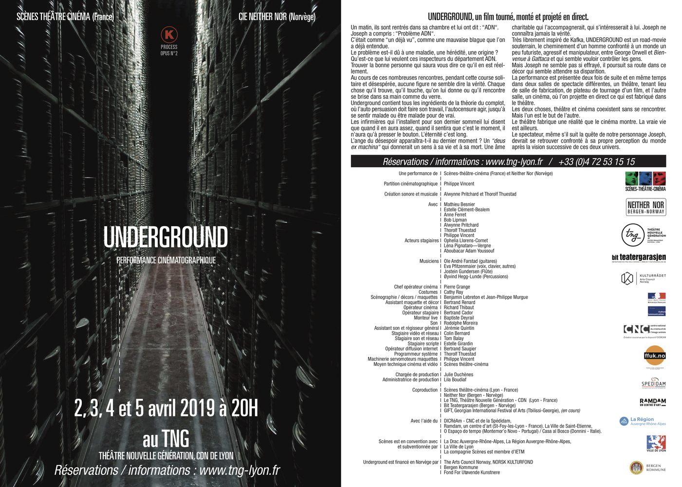 Underground1 is a large-scale stage production featuring 30 technicians, musicians and actors inspired by Franz Kafka's writing. It is a hybrid film/theatre production directed by Philippe Vincent, script by Philippe Vincent, Alwynne Prithcard, Thorolf Thuestad and Anne Ferret, created and produced by the French company Scènes Théâtre Cinéma and Neither Nor based in Bergen, Norway. For the production I composed the score and created the sound design/live foley together with Alwynne Pritchard as well as performing as an actor and developing control systems for motorized set pieces and matte paintings.