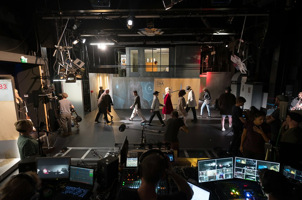 In the performance, the audience is divided into two groups, each experiencing events from two different perspectives. As one group in the theatre space watches the live filming of Underground as a stage piece, the second group in the cinema experiences it as a film, shot, edited and relayed live. All the technicians, actors, camera operators, foley artists and musicians are on the stage. The set design is a mixture of small-scale, modular set components, full-size rooms and environments and all the equipment needed to make a movie: travelling crane, jib, cameras, tripod, microphones, wireless systems etc.