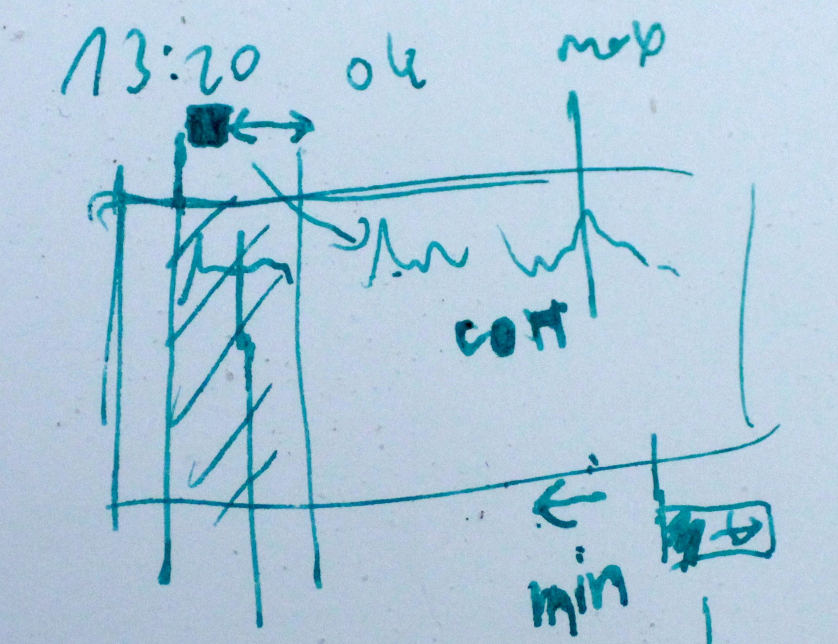On the right, that's how I sometimes sketch a small algorithm that I want to employ for a sound. This is from an ongoing electroacoustic composition Shouldhalde, and I have a section of one of its parts that I'm not happy with—the sound is still a quite raw microphone recording, you hear the acoustics of the studio, it produces the “wrong space” so to speak. I bounced the 8 minute section, and the idea is to reorder all the sound particles in it, in a variant of what in classic FScape is the StepBack module. That module does a segmentation of a sound, based on local minima in autocorrelation, and then reorders the segments in reverse order. What was developed in the sketch, can be easily formulated in language: Go through the sound. There is a minimum segment length, below which no cutting is down. After the minimum length has been reached, start cross-correlating the sound with “the remaining chunk” of the sound, stopping after a given maximum duration. Determine the local maximum of the cross-correlation; cut the sound here, and proceed by jumping to the correlation partner. “Remove” the parts of the sound which have been “used” so far, and repeat. That's a simple description, but difficult to formulate with the given UGen infrastructure. It requires structured data; for example, one has to maintain a list of regions of the sound that until now have not yet been used. After each step, the used region must be “removed” from that list. And we need random access to the sound. I could implement the whole algorithm as one new UGen. But that goes against the idea UGens as smaller reusable atoms instead of more complex compound algorithms.
