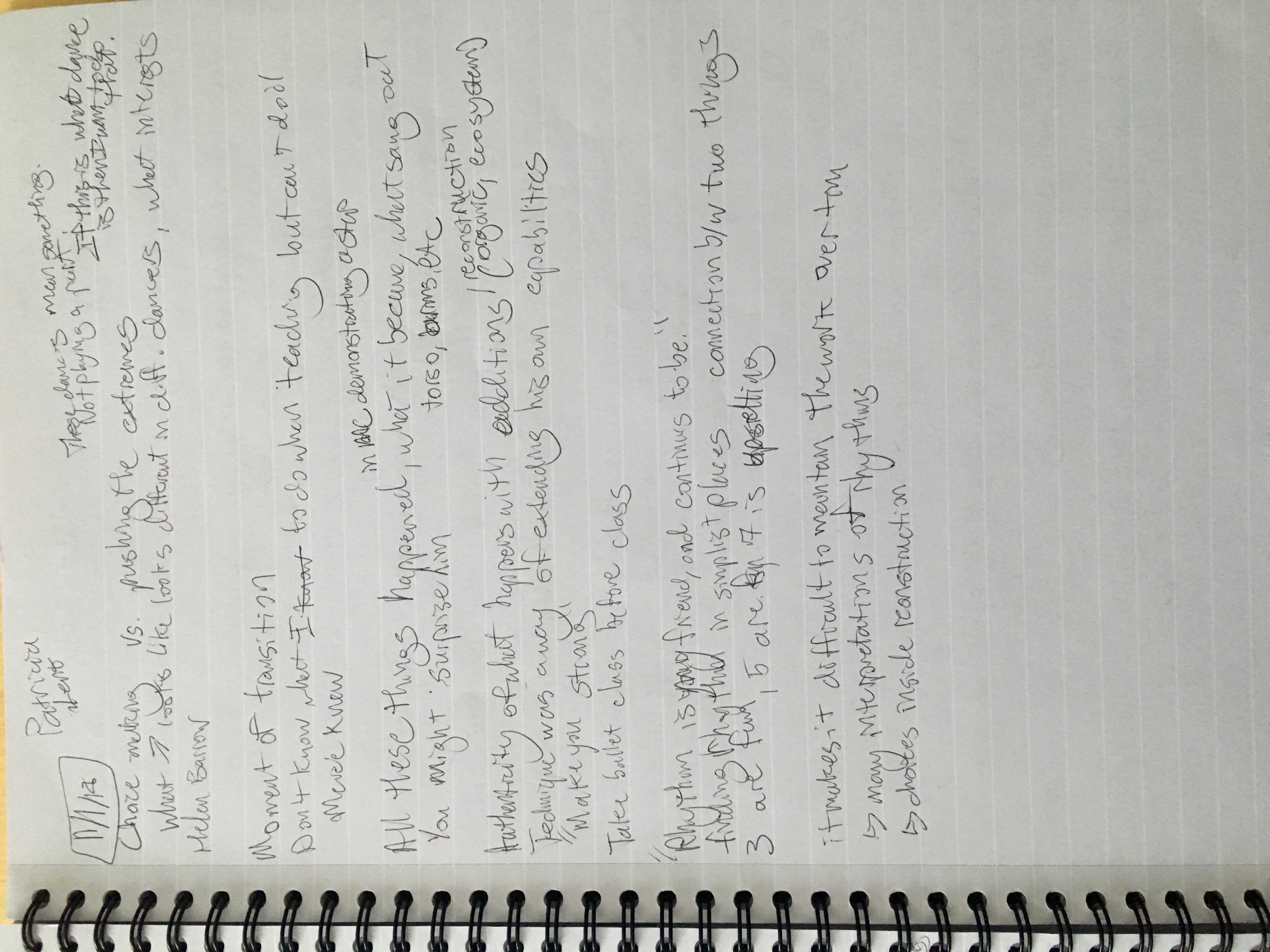 These texts are an invitation to offer insight into this poetic and personal practice developed during the course of my study. Through a regular and ongoing studio practice I draw on my personal dance history as material in an attempt to understand the affective and performative aspects of devotion in dancing, the very devotion which both obscures and reveals something intimate, but beyond the subjective. Recalling and amplifying the ghostly present and presences in a film recording of a single Cunningham technique class, I have been exploring the spectral remains in the transmission of a dance technique, from recording of living bodies to a digital, publicly-available video and then to my corporeal reinterpretation of that video. By continuously repeating the same material over the course of nearly two years I have developed a multilayered understanding of the material, which allows me to depart from and return to the class through associative portals. I bilocate between the physical site of practice and the space of recall, between an action from the class and the memory of that action. I enjoy the strange spectral things that arise from this practice: ghosts, portals, other bodies. With my eyes closed, my attention is displaced from image to sensation. It’s about work. “Not to show off, but to show,” as Cunningham said. It’s about toil. It’s about devotion. These slippery materials propose to invert the traditional choreographic relationship to presence, and instead call upon memory, absence, and dislocation to provide an understanding of movement through time and space. This collection is comprised of texts written at various points throughout my two years in the MA program New Performative Practices (NPP) at Stockholm University of the Arts. My focus on devotion in Cunningham technique originated as a self-organized Advanced Independent Study. This course was built on readings, a solo studio practice, teaching others, and interviews with former Merce Cunningham Dance Company members. I created exposition on the Research Catalogue as part of my exam, a precursor to this one. In creating the exposition, my notebook became a central tool, a material I carried and used everywhere, from the studio to the classroom to interviews to the library, all places where I carried out the study. I wrote texts on top of photographs of my notes, and the presence of two texts situated together suggests dynamic reading possibilities. This MA is research-preparatory and strictly speaking this is not artistic research. I’ve taken advantage of the liberty being independent of formal academic research offers. The traditional citation models, academic formatting, and impartial address have been left behind at times to favor for a looser, more experimental formatting, multiple styles of essays, and a piece-meal approach to continuity. Thanks to: Anna Giertz for design and layout of the print version, which inspired this version; Chrysa Parkinson, Litó Walkey, Jeanine Durning for supervision; Frank Bock for portals; Martin Hargreaves for unpacking performativity; Rebecca Hilton for the initial push; my NPP colleagues for their feedback, curiosity, and support; Ken Tabachnick for insight from the Merce Cunningham Trust; Patricia Lent, Andrea Weber, Joseph Lennon, and Michael Cole for interviews; Sarah Michelson for devotion; Moriah Evans for searching for forms; Kris Berggren for the ordinary devotion which got me here, and copy editing; Pat Richter for her music; Robert Swinston for class, again and again.