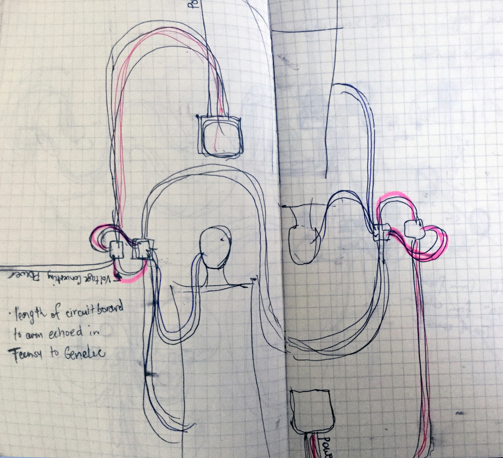I made this little drawing. I was thinking about booking it like a session or something like that, where two people can agree to like a 15 minutes period where they just chill out and compare their two biosignals, because I hate the idea of the installation just sitting there and people coming in or not. I think they will be both tuned slightly differently, because skin conductivity levels are different from people: some people are just more sweaty than others. So they will be tuned differently, and then it will just be a little duet for 15 minutes. And I think it’s important that you are lying on the ground, because it’s just somehow more medical, or embodied. If you just sit down on a chair and hook yourself in is just a different posture.
