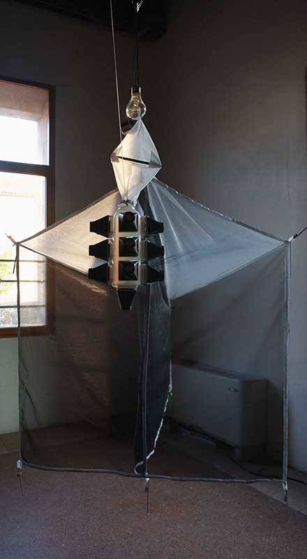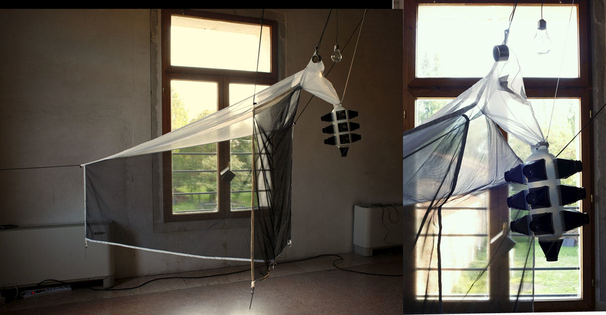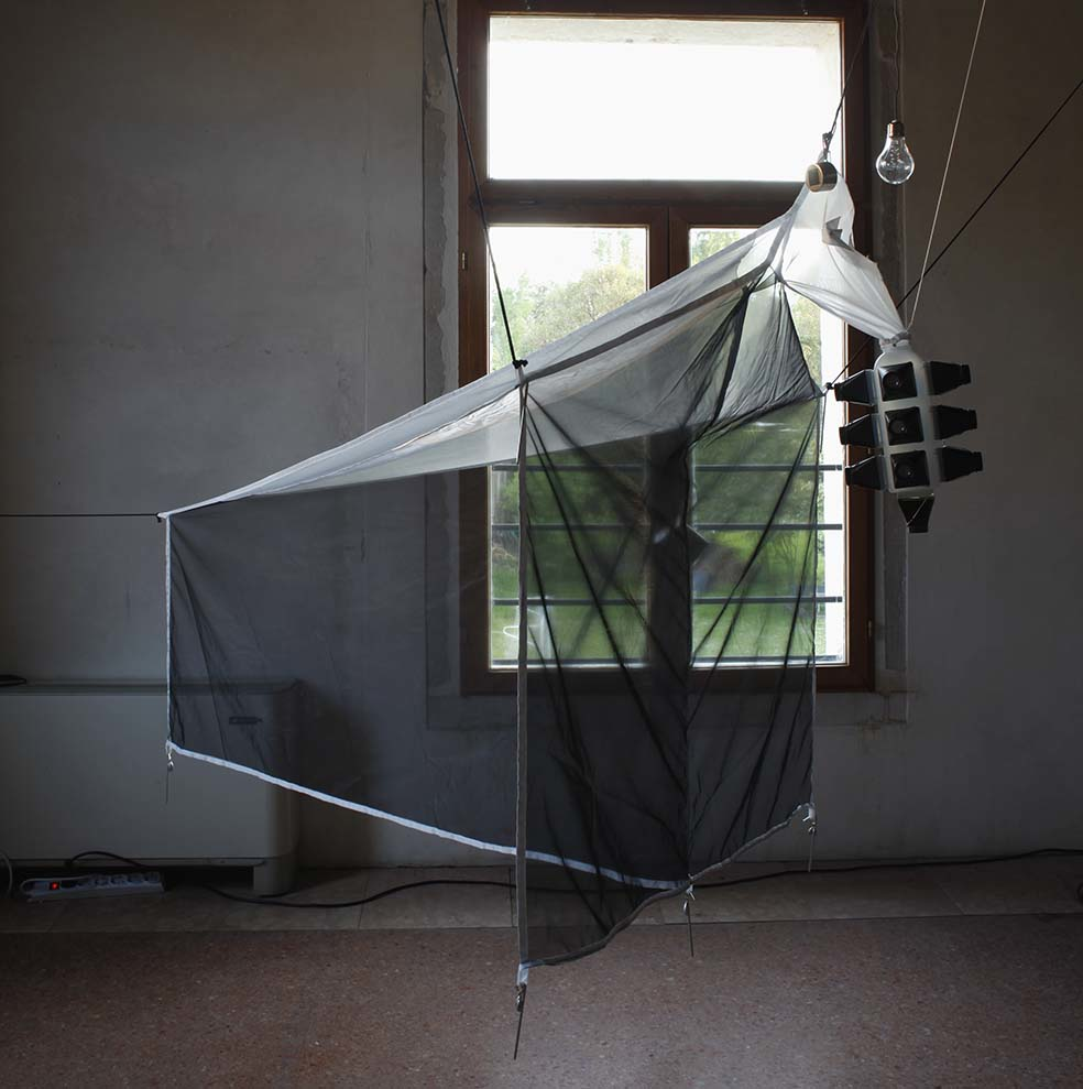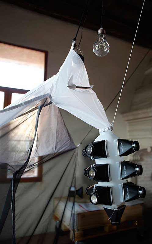The work transforms René Malaise’s inventive design into a collective viewing device. In our exhibition no living insects will be trapped. Instead, the collecting jar of an entomological malaise trap is replaced by slide viewrs. Each slide viewer shows a photograph of an insect bite.