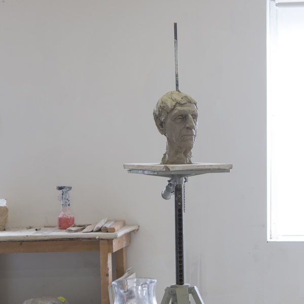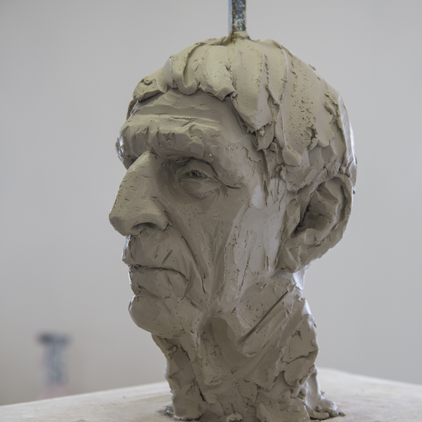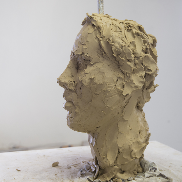 I take my time, concentrated and at length, to study my model's face from a distance, nearby and switching between proximity and distance. I use a piece of laminated chipboard covered with canvas and a metal bar mounted on top on which I apply the clay. In the beginning I try to grasp the contours and main form of the head as quickly as possible. I study and compare my sculpture with my model and try to get the big picture. I do not work with details until a rough sketch is done. But I tend to work on the left hand side first since I am right-handed the model's left hand side is easier to reach.