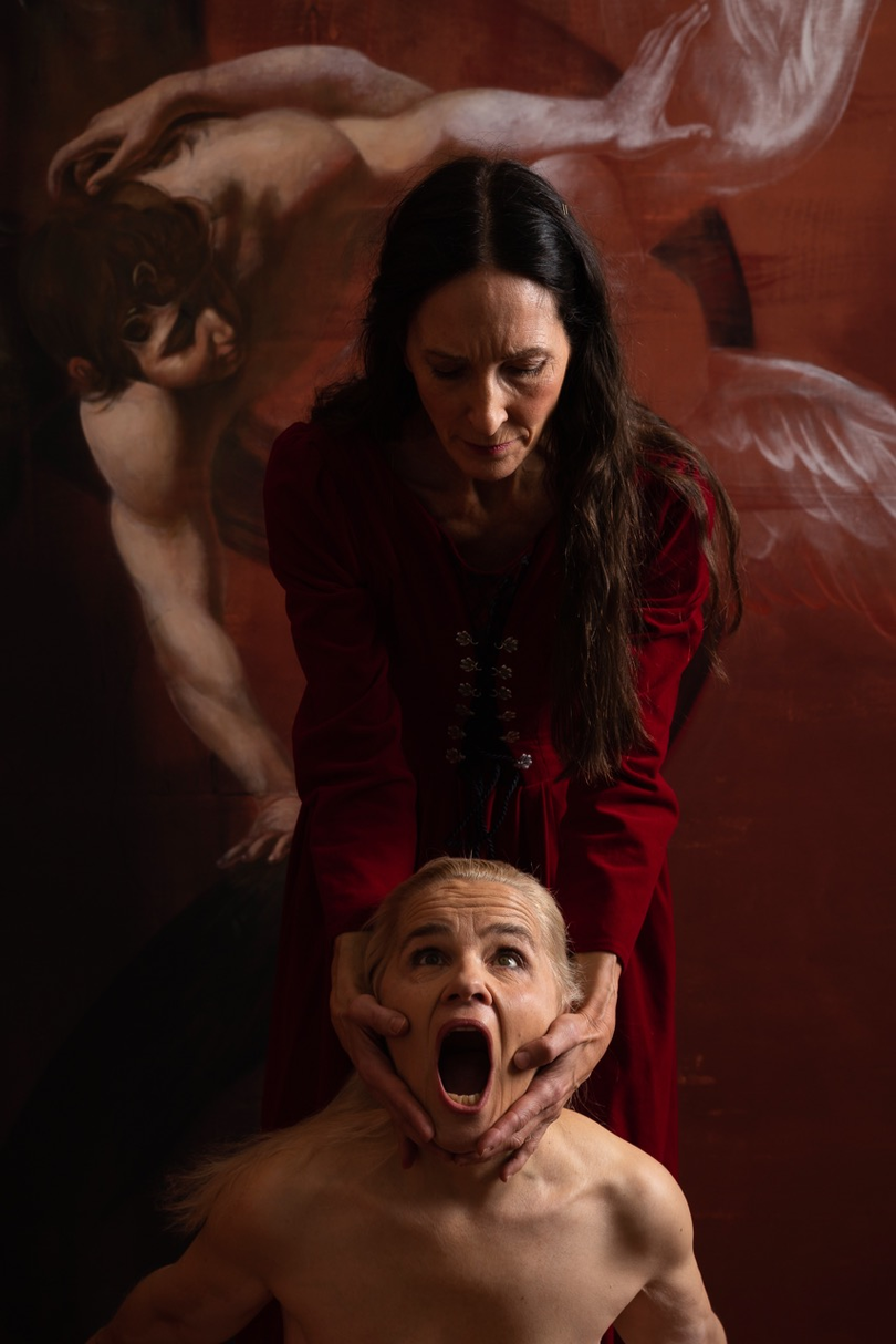 Suddenly, the Gorgons scream, Medusa/Mary is dead. She finally gives birth to Pegasus and Chrysaor (lit. golden spear). Cries of dying/giving birth.