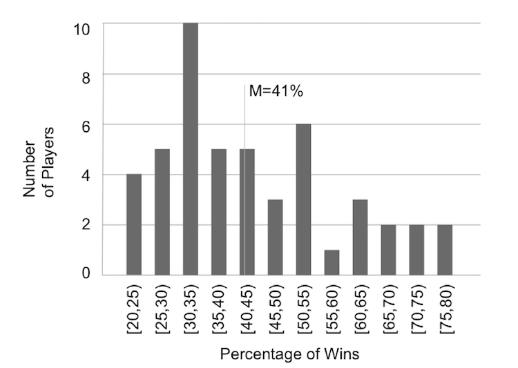 The key design goals of our multimodal display were validated in the experiment. First, the decision-making task had a general success rate of about 41%, within the desired range of 40-60%, necessary to allow a sufficient number of both correct and incorrect trials (Williams, Nesbitt, Eidels and Elliott 2011). However, there was considerable variation between players, with four of the 48 players averaging below a 25% success rate and another four achieving higher than 70% of correct responses when all their trials were considered. Figure 7 shows the distribution of win-percentage across players (the line marks the mean correct rate of 41%).
